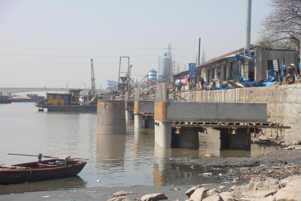南通船闸下游引航道护岸加固施工项目A合同段位于船闸下游引航道右侧辅导航墙向下游方向500m段,凿除老驳岸▽2.3 m(废黄河高程系,下同)以上墙体,新筑C25砼踏步的形式与原地面衔接,墙后采用深层搅拌桩加固,墙前底高程▽-0.8m以下采用抛填袋装碎石防护,平台宽度2m,并以1:1.5的边坡护至河底设计高程。前沿距离原护岸临水面7m新建靠船墩,靠船墩采用钻孔灌注桩基础,墩身为独立靠船墩空箱结构,靠船墩间距20m,共25个,靠船墩采用预制板结构与岸衔接。(与船闸纵轴线呈垂直布置)。